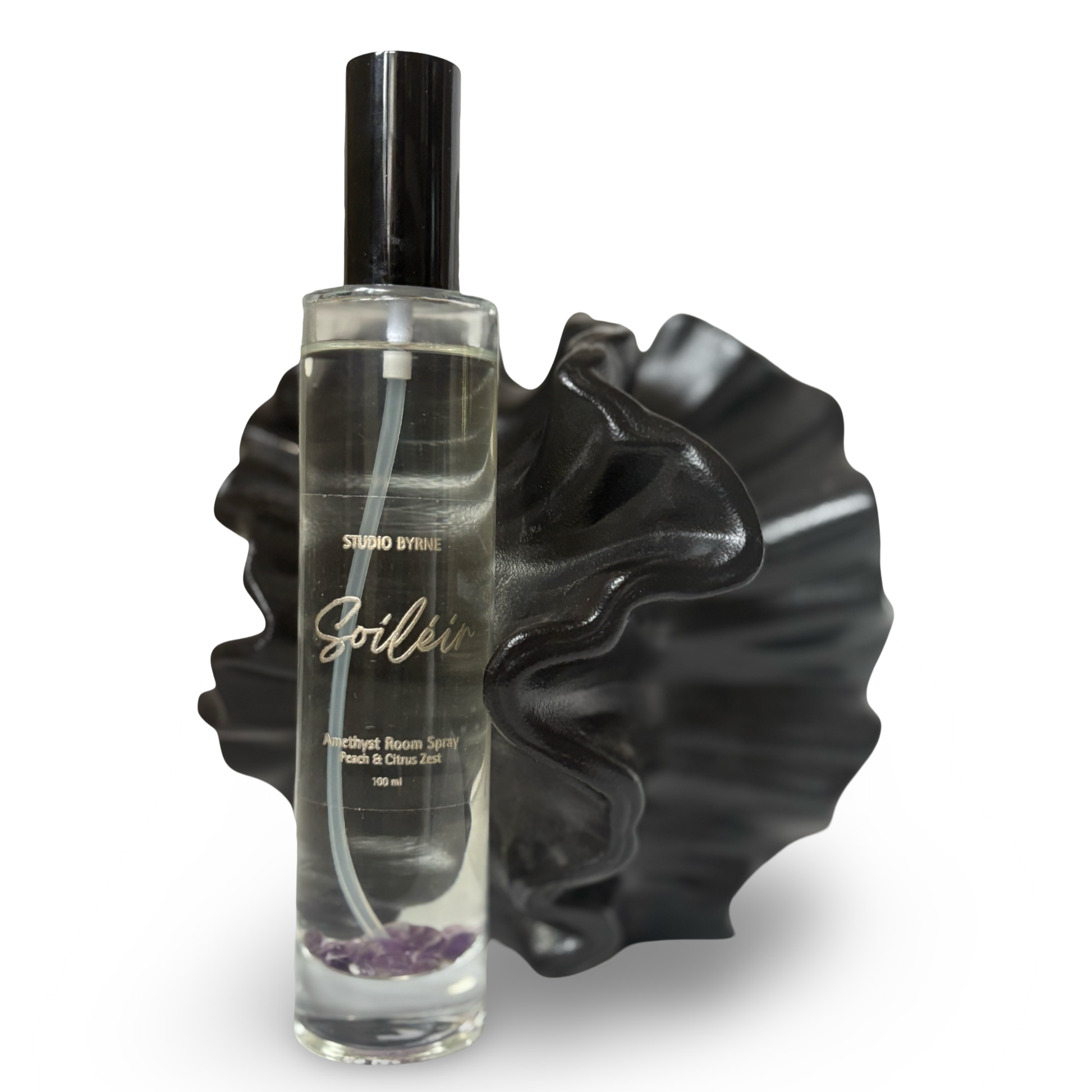 Like sunshine and sea breeze in a bottle, Soiléir blends coconut peach, lemon-lime zest, and soft vanilla for a scent that’s nostalgic and freeing. Infused with Amethyst, this spray promotes calmness, creativity, and quiet confidence — encouraging you to shine.